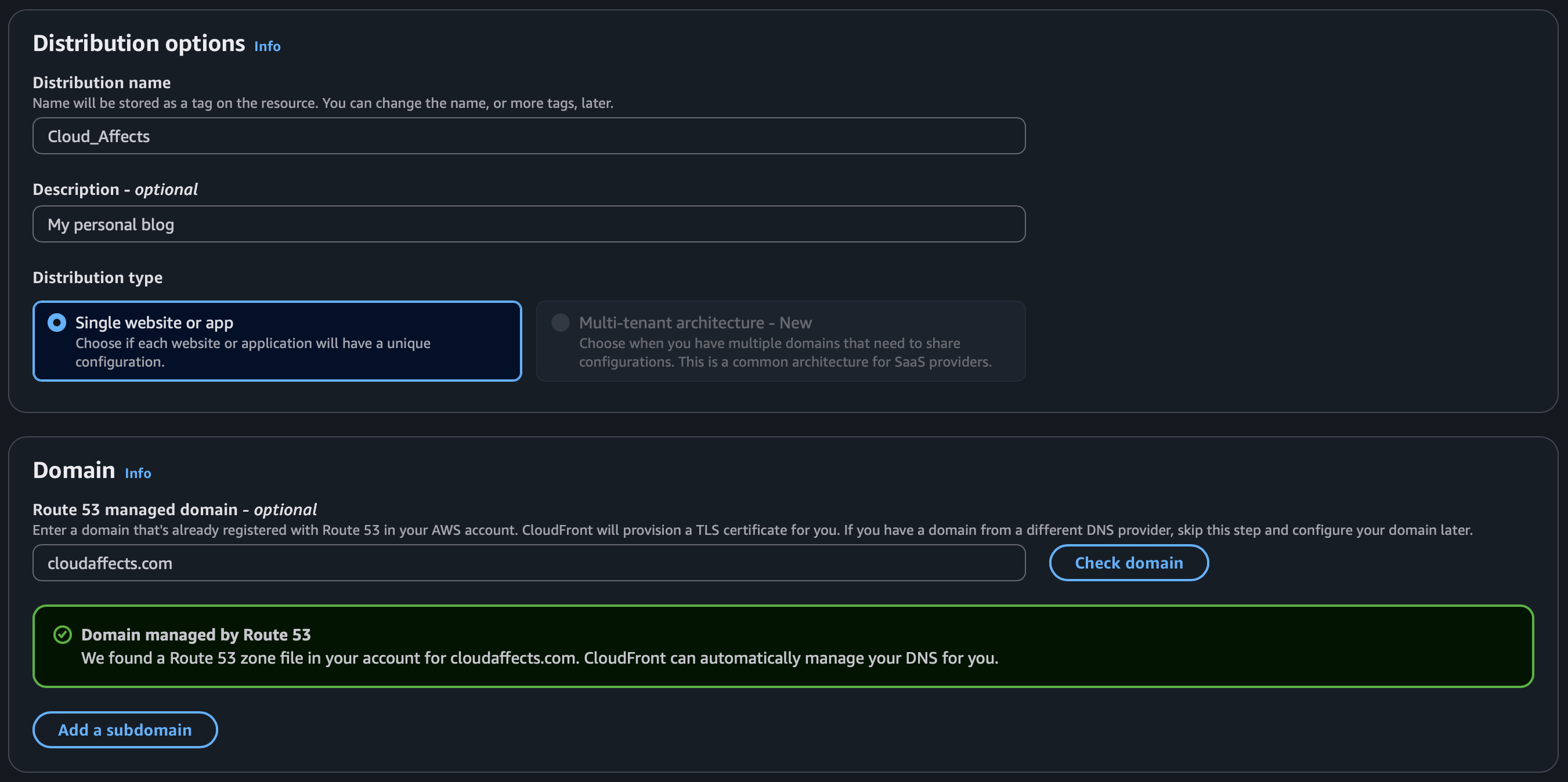 Wait for it to deploy, then go into the created distribution and click “Route Domain to CloudFront”.