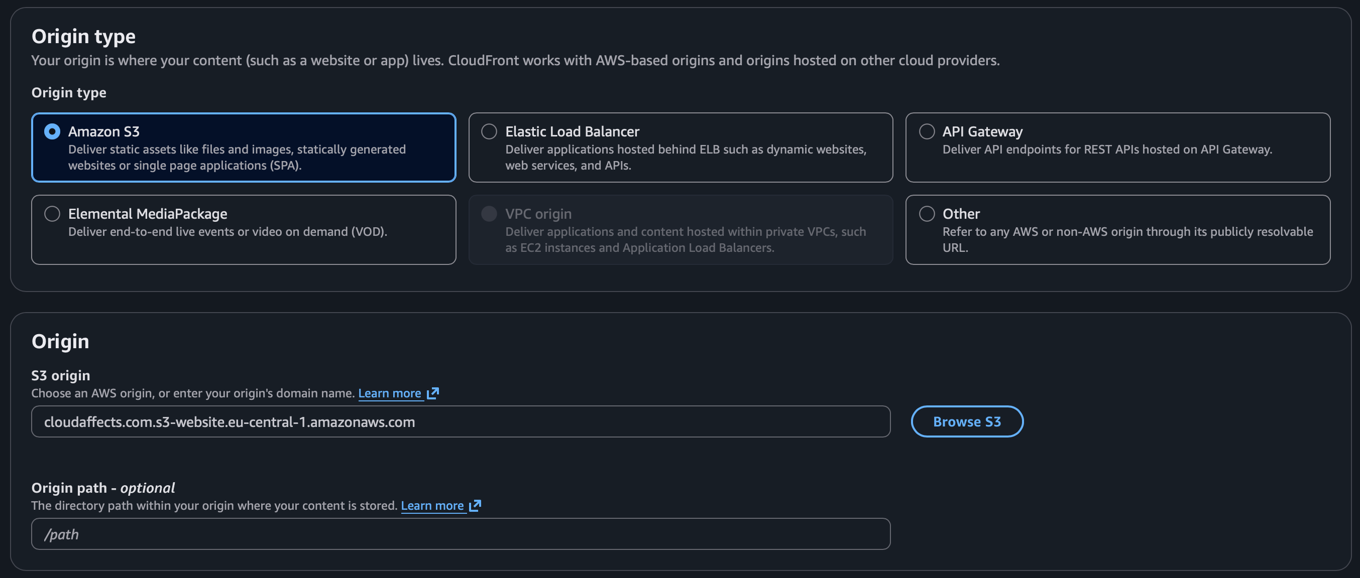 Origin: use the S3 website endpoint. SSL certificate — select the certificate created in the previous step (if it’s not there, it was likely created in the wrong region).